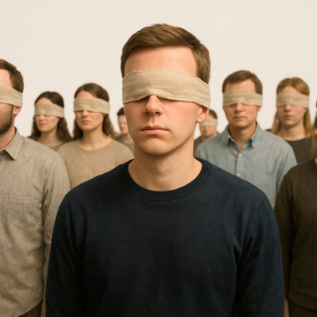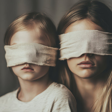Two girls one adult and one child sit side by side with their eyes covered by cloth strips creating a poignant atmosphere of trust and mystery.