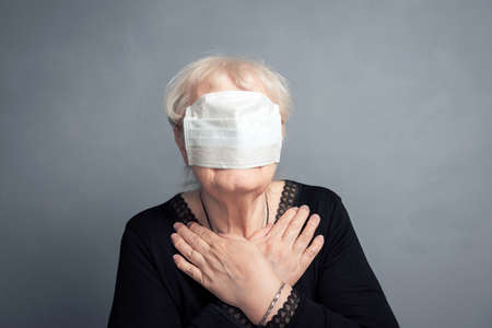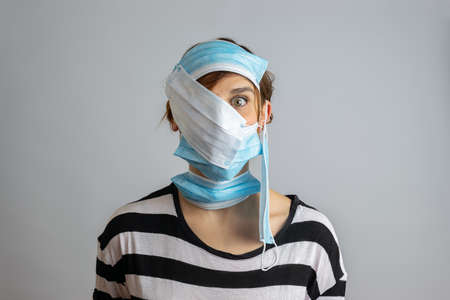 Funny portrait of an overprotective woman with whole face covered in surgical masks in a gray background