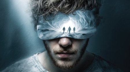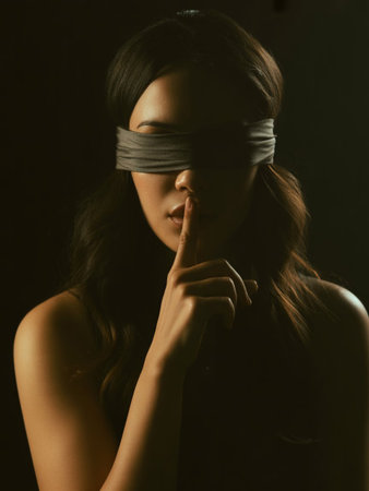 A person stands with a band of fabric over their eyes emphasizing themes of concealment and introspection in low light.