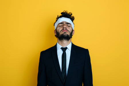 A funny man dressed in a black suit sports a headband bandage while striking a playful pose in front of a vibrant yellow backdrop.