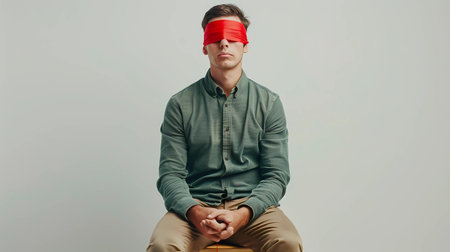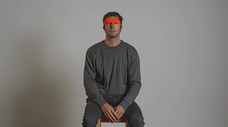 Young man in a black sweatshirt with a red bandage on his eyes sits on a wooden chair on a gray background