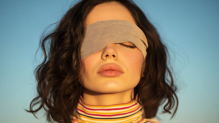 Blindfolded Woman in Striped Shirt Against Clear Blue Sky.