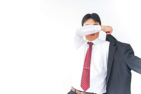 young man with hands covering eyes standing with isolated background. careless and afraid concept