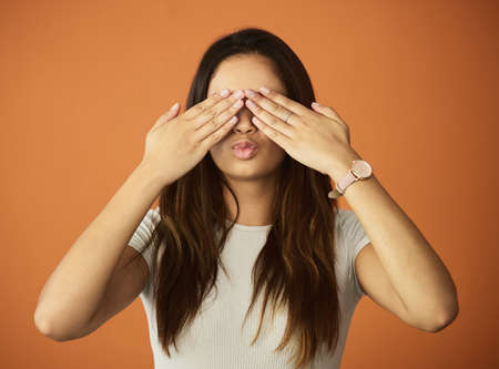 Asian lady covering her eyes.Concept of the three wise monkeys of Gandhi and following the maxim of Kikazaru, covering his ears, who hears no evil. They are also referred to as three mystic apes.
