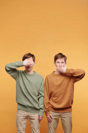 One twin brother in sweater covering eyes while other brother covering mouth against orange background