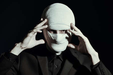 Business concept. Studio portrait of a businessman in a black suit and black shirt with a bandaged face looking directly into the camera. Black background.