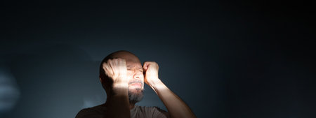 Man in his 50s, emotionally shaken showing stress or pain gesture. Feeling weak or depressed. Isolated on dark background.