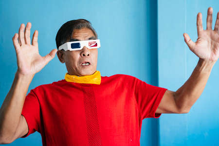 Portrait of a man with his face covered in masks and glasses above them with a blue jacket with hood on a white background