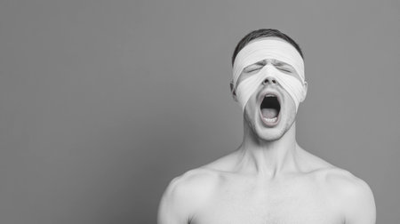 Man with bandaged face expressing emotion, emphasizing vulnerability and intensity, captured in a dramatic black and white style