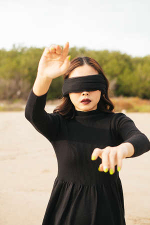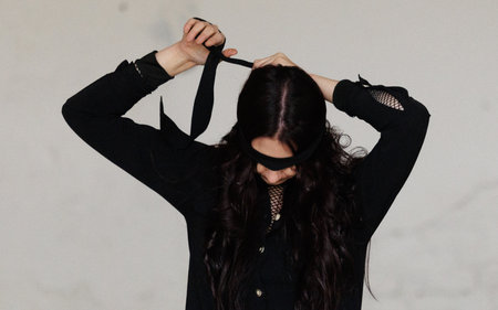 Portrait of a woman in black wearing a blindfold. Long dark hair and expressive pose against a plain background. Conceptual image symbolizing mystery, identity and inner reflection
