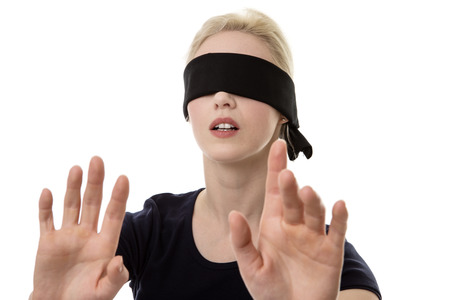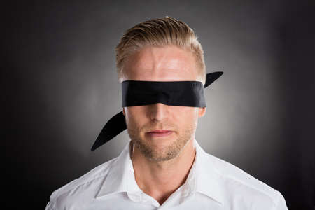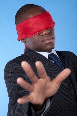 Businessman wearing a black blindfold, representing themes of ignorance, blind trust, hidden facts, censorship, business risk, and a lack of clear vision