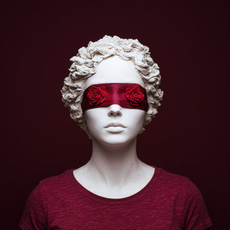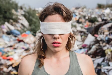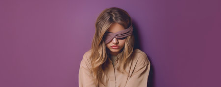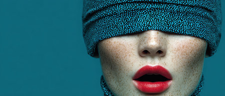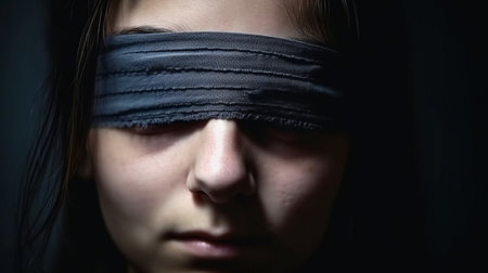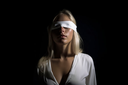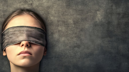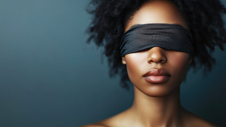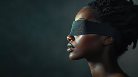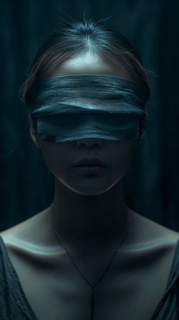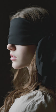 Young woman in profile wearing a blindfold, symbolizing justice, impartiality and uncertainty as shadowed features evoke hidden truth, doubt and an unclear future
