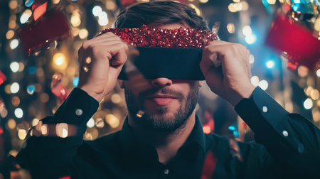 A man enjoys the Christmas celebration playfully blindfolded surrounded by colorful decorations and festive confetti in a vibrant atmosphere.