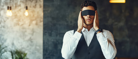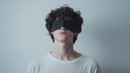 Young man with a black blindfold covering his eyes, symbolizing blindness, ignorance and deception, conveying vulnerability, concealment, uncertainty and hidden truth