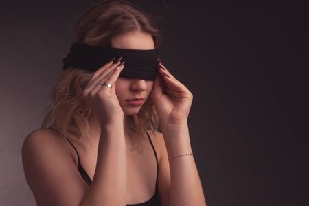 Studio portrait of a blonde on a dark background in a dark dress he closes his eyes with a red ribbon
