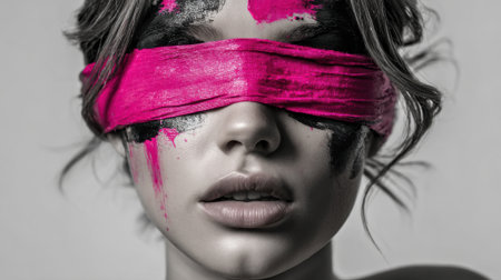 In a creative setting, a young woman with a blindfold made of bright pink fabric captures attention, showcasing bold paint on her face and a striking monochrome background.