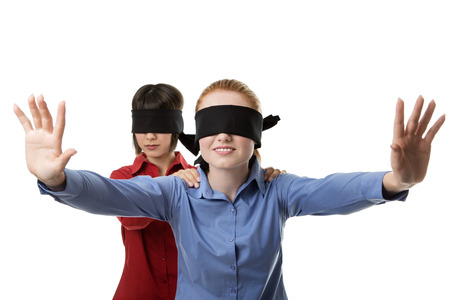 Two girls one adult and one child sit side by side with their eyes covered by cloth strips creating a poignant atmosphere of trust and mystery.