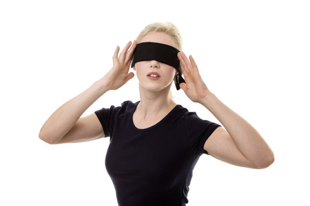 Young woman smiling with blindfold covering her eyes, expressing optimism and trust