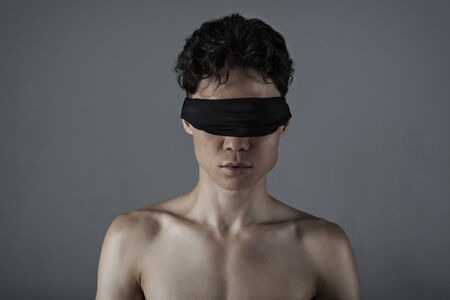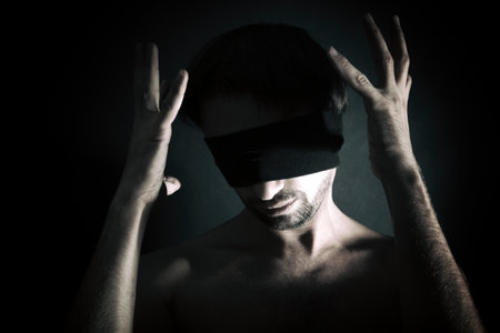 Young man covering his eyes with a black blindfold, creating a powerful portrait representing concepts of censorship, injustice, ignorance, restriction, and lack of vision on a dark background