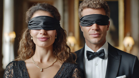 A joyful couple playfully covers their eyes with fabric, smiling and enjoying their time together.