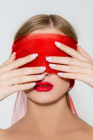 Beautiful cosmetic woman clean portrait, with red tape in eyes
