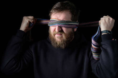 a man blindfolded himself with a scarf so as not to see what is happening in the circle. run away from problems