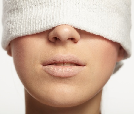 Bandaged eyes of young woman, conceptual indoor portrait. Person who doesn't notice anything. Patient after plastic or elective eye surgery. Girl with bandage on her head. Blind