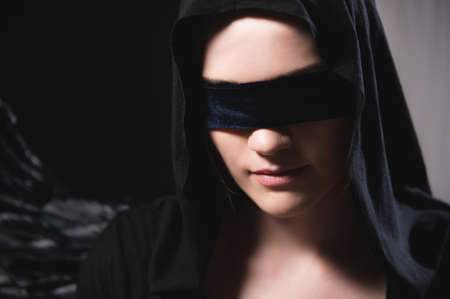 Portrait of an attractive young woman in a hood and black cape with a blindfold. Low key sexy caucasian girl justice and role playing on black and gray background