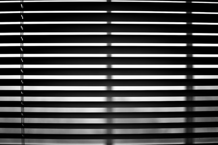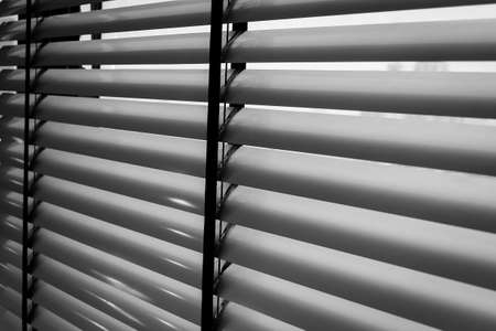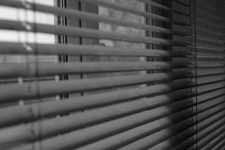 Horizontal metal jalousie. Side perspective view. Black and white photo