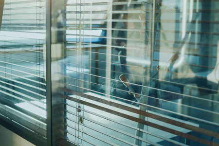 Modern silver aluminum blinds on an office window. Control the degree of light in the office conference room. Selective focus