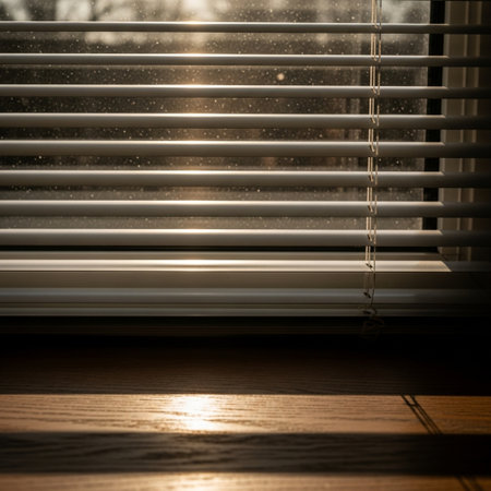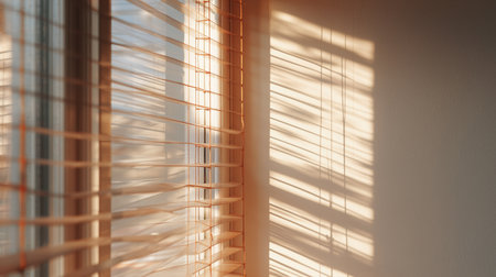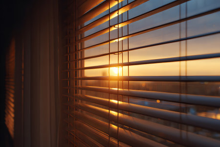 Warm golden light streams through the slats of window blinds, creating a peaceful atmosphere during sunset in a quiet room. The soft glow enhances the tranquil setting.