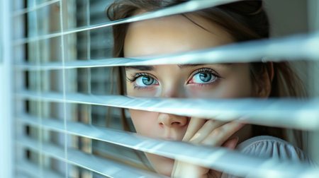 A woman hesitantly peeking through blinds with a concerned expression --ar 16:9 --style raw Job ID: d8d1b38a-7816-4952-862c-2a12858c797b