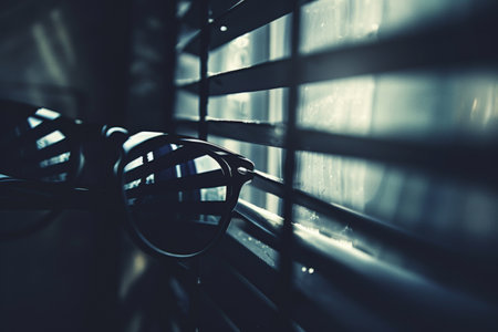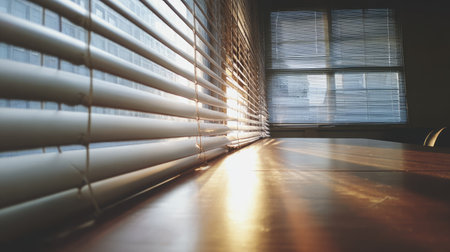 A serene scene showcasing soft sunlight streaming through blinds, casting gentle shadows on a polished wooden table in a modern office environment.