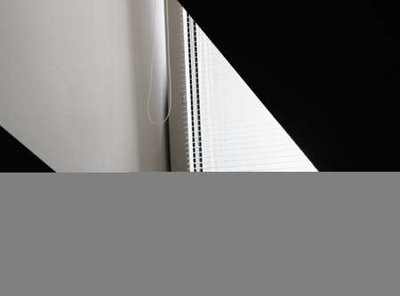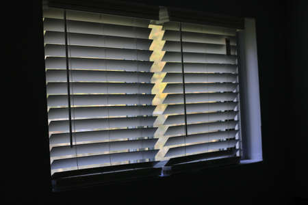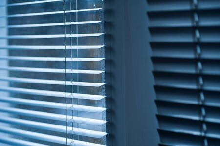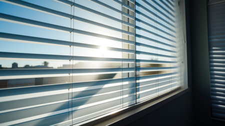 Blinds on window. White blinds cover window from sun. interior details. shooting diagonally.