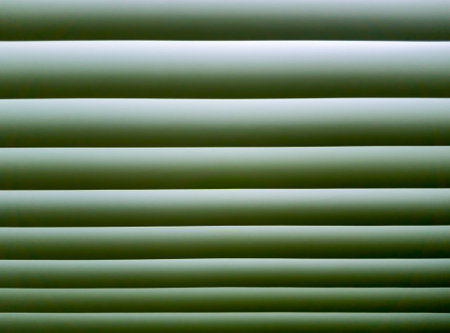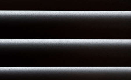 Detail on metal window blinds, some light reflects on, dust visible, abstract geometric background