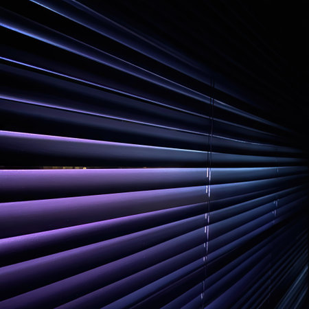 This image features a close-up of geometric blinds, showcasing a gradient of purple and blue tones. The composition emphasizes lines and shadows, creating a sense of depth. The photograph likely depicts an indoor setting, possibly for use in design, marketing, or editorial projects.