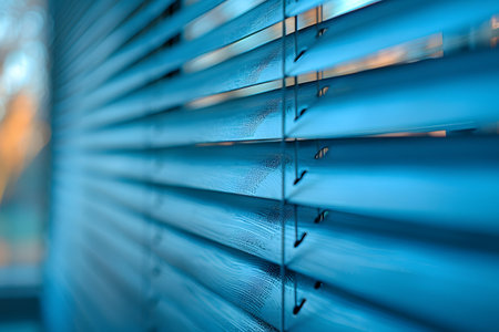 Blue horizontal window blinds partially opened, showcasing the texture and design, with soft natural light filtering through. ideal for modern interior design, providing privacy while controlling light, enhancing home and office aesthetics. Generative AI