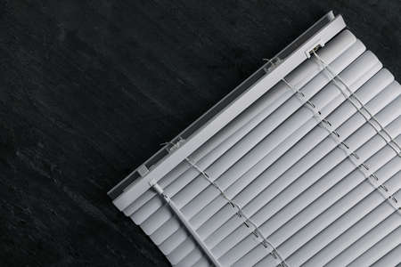 Closed metal jalousie, wand and rope macro image. Background blinds. Black and white photo