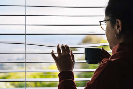 Woman drinking coffee and looking outside through American blinds. Copy space