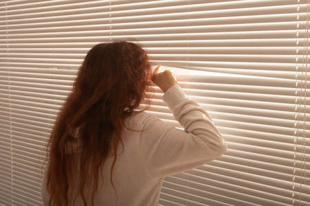 Rear view of beautiful young woman with long hair peeks through hole in the window blinds and looks out the window. Surveillance and curiosity concept