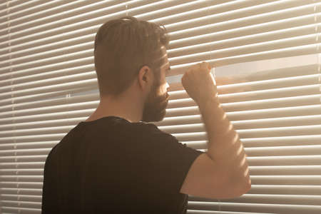 Rear view of young man with beard peeks through hole in the window blinds and looks out into the street. Surveillance and curiosity concept