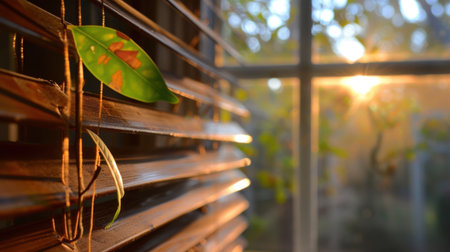 A tranquil indoor scene featuring a vibrant green leaf against wooden blinds, illuminated by soft sunset light filtering through a nearby window.