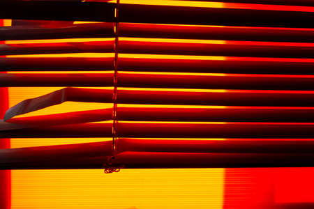 Wooden blind on the window with sun rays. Office blinds. Wooden shutters blind. Vintage color style.