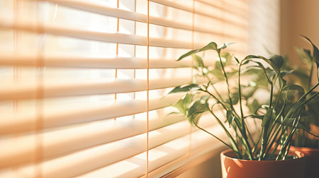 Close up of window with blinds in the sun shining through it. Generative AI.
