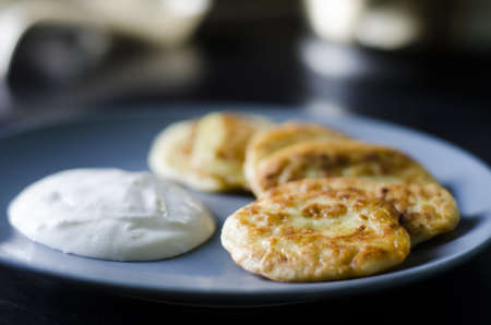 Pancakes with zucchini vegetable and sour cream, home cooking. Close-up. Vegetarian food.