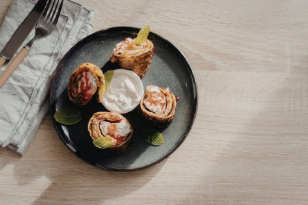 Simple pancakes or crepes with wrapped filling and garnished with herbs on white plate. Traditional breakfast or lunch on wooden table in restaurant. Square format.