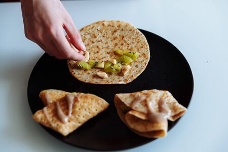 Woman's hand decorates pancakes with a fruits kiwi and banana. Black plate, white table.