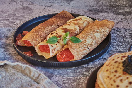 thin pancakes with red caviar on gray canvas napkin. The concept of the Russian carnival Maslenitsa. space for text