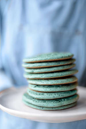 Freshly cooked soft delicious gluten free pancakes stacked on white plate, served with fresh bilberries, close up. Space for text. Healthy sweet food.