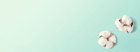 Cotton branch. Real delicate soft and gentle natural white cotton balls flower branches on light green background. Flowers composition. flat lay. top view. minimal style.